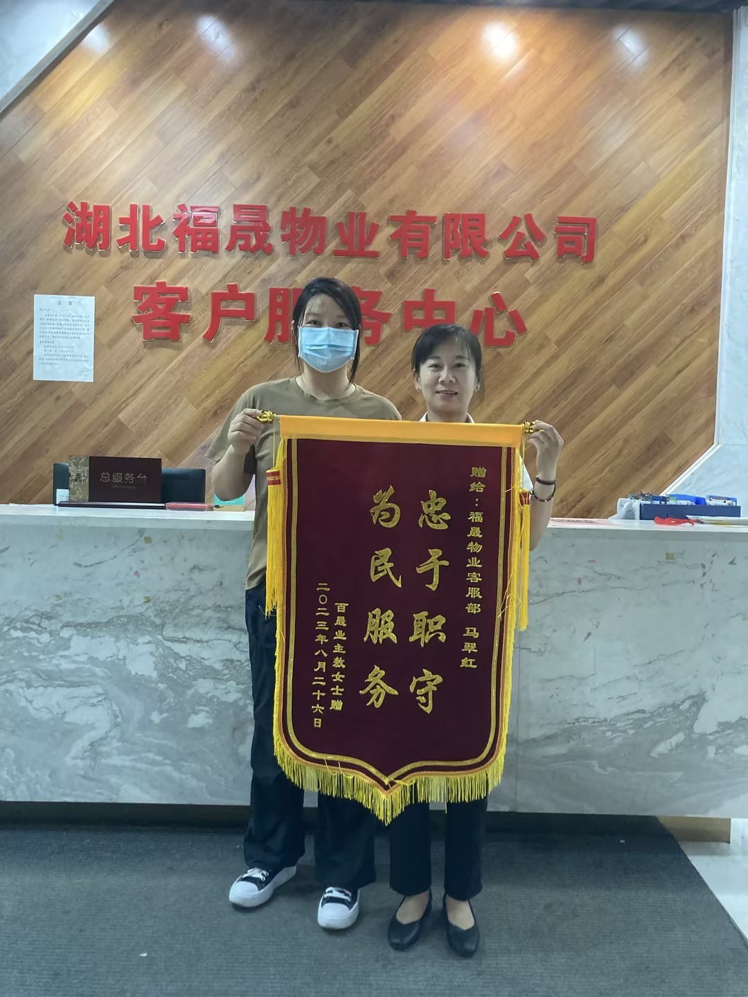 一面錦旗,一聲好評(píng),一份滿意,是對(duì)物業(yè)服務(wù)工作人員的最大“褒獎(jiǎng)”,每一面錦旗都記錄著感動(dòng)與溫暖,每一次感謝都承載著認(rèn)可與肯定。8月27日,湖北福晟物業(yè)中心先后走進(jìn)了這樣的兩位業(yè)主,4-2-3002和13-2-1303的業(yè)主心存感恩之意,各自帶著錦旗來到物業(yè)服務(wù)中心,贈(zèng)予樓管家魏坤珍和馬翠紅。