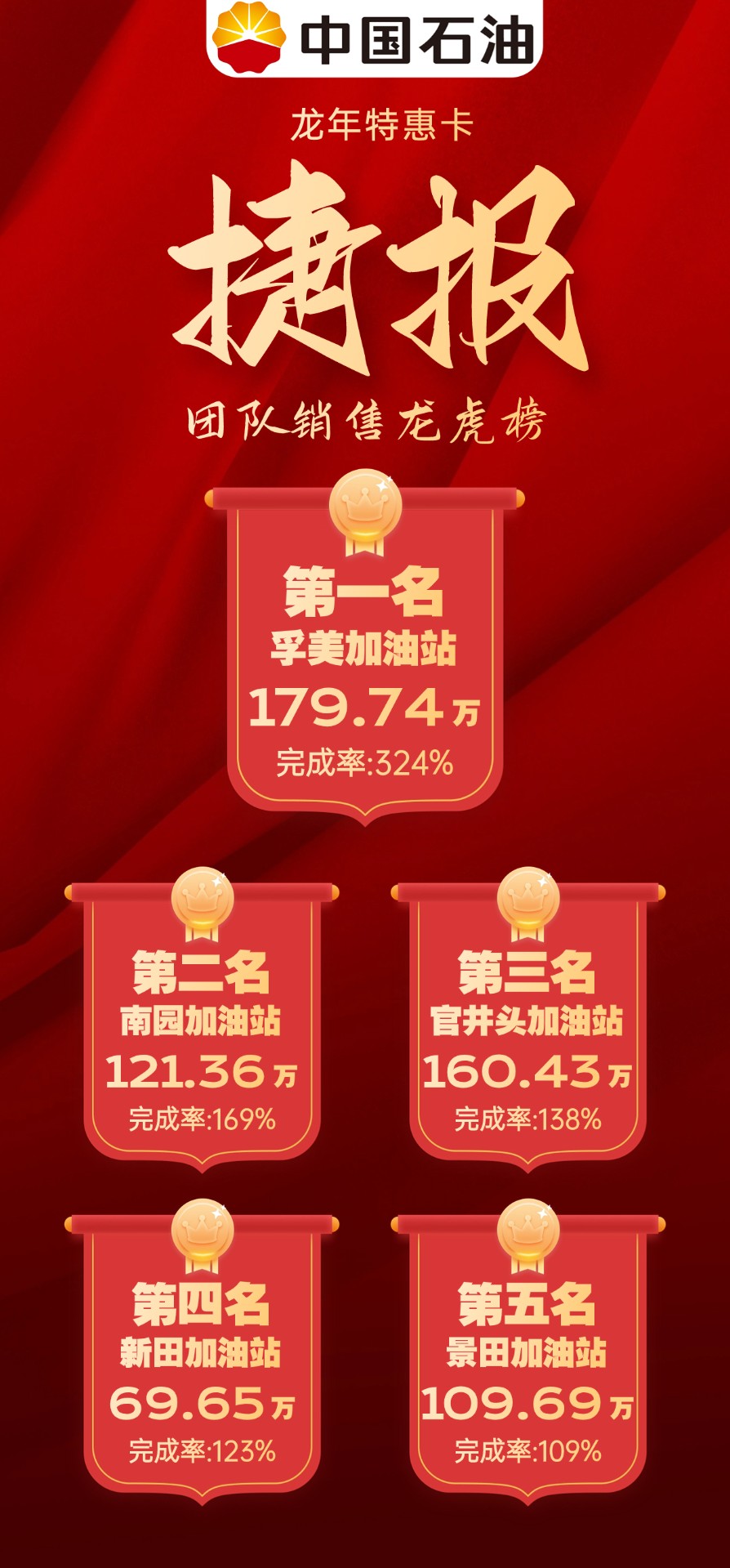 1月1日至31日,零售事業(yè)部開(kāi)展了油非互動(dòng)龍年特惠卡銷售比武活動(dòng),各油站高度重視此次銷售比武活動(dòng),全體員工銷售熱情高漲。在各油站員工的積極努力下,比武活動(dòng)共完成了1332.77萬(wàn)元的銷售業(yè)績(jī)。其中,孚美加油站以179.74萬(wàn)元的銷售業(yè)績(jī)獲得第一名。